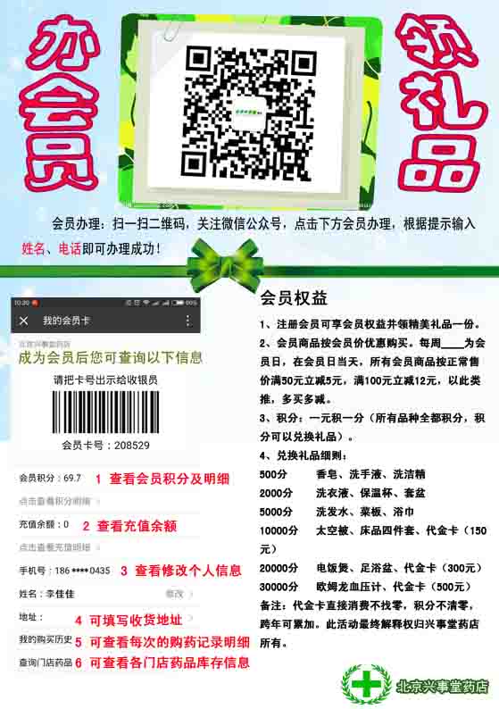 顧客只需關(guān)注“北京興事堂興海大藥房”微信公眾號,在公眾號下面點擊會員辦理,根據(jù)提示,點擊申請會員卡,然后輸入自己的姓名,電話就可辦理成功,此時您將獲得自己專屬的會員卡號,您不僅可以根據(jù)報會員卡號來店購藥時進(jìn)行積分累計,也可用辦理會員卡時的手機(jī)號碼進(jìn)行累計積分。